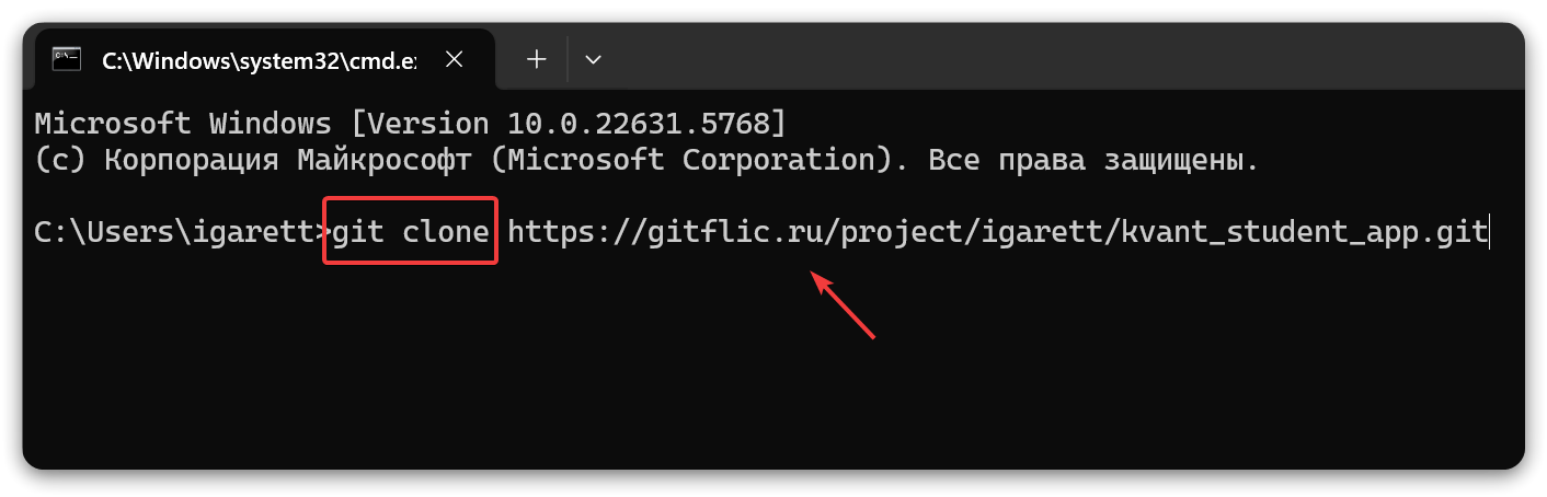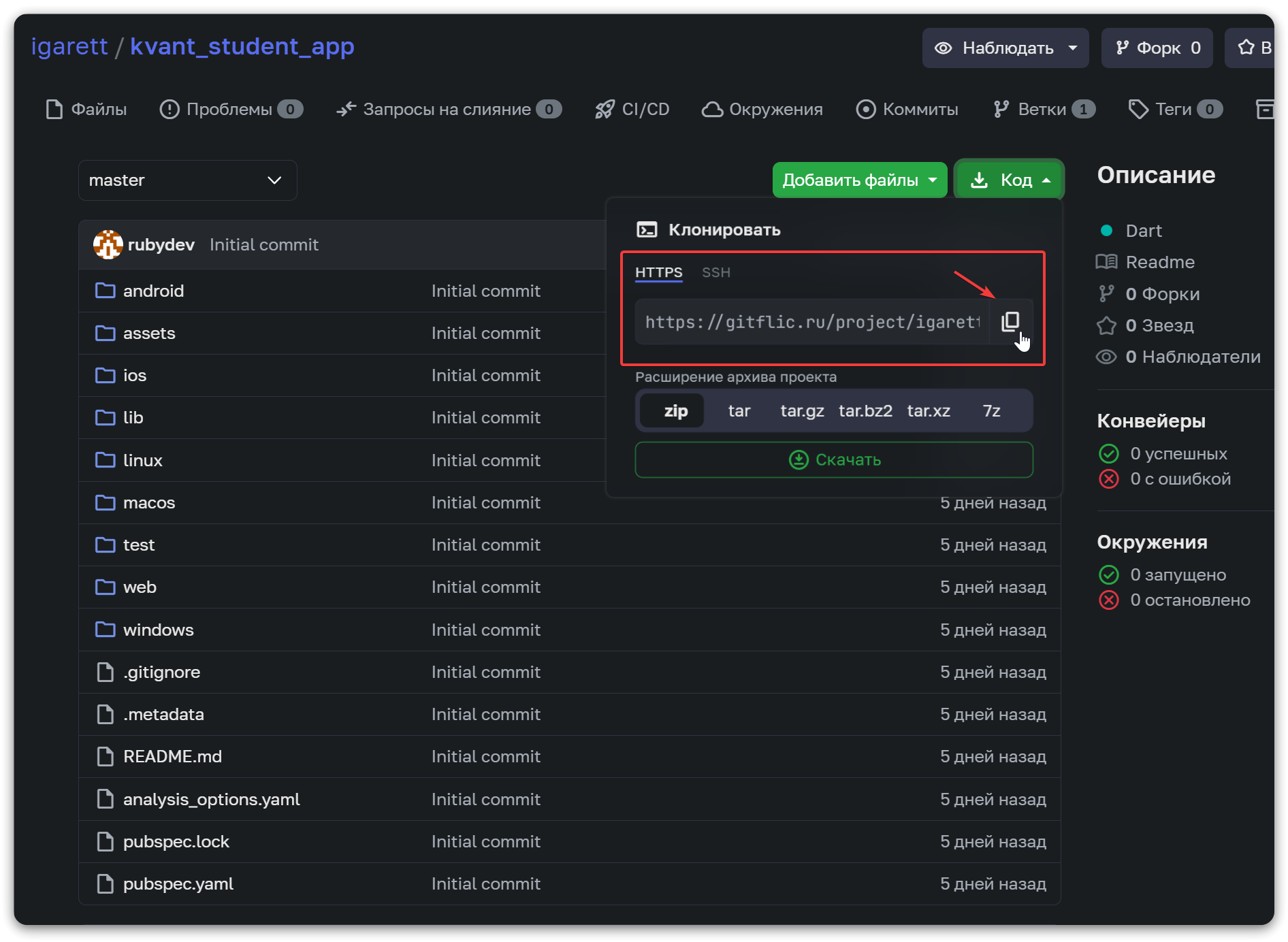 Переходим по ссылке на удаленный репозиторий с кодом GitFlic https://gitflic.ru/project/igarett/kvant_student_app