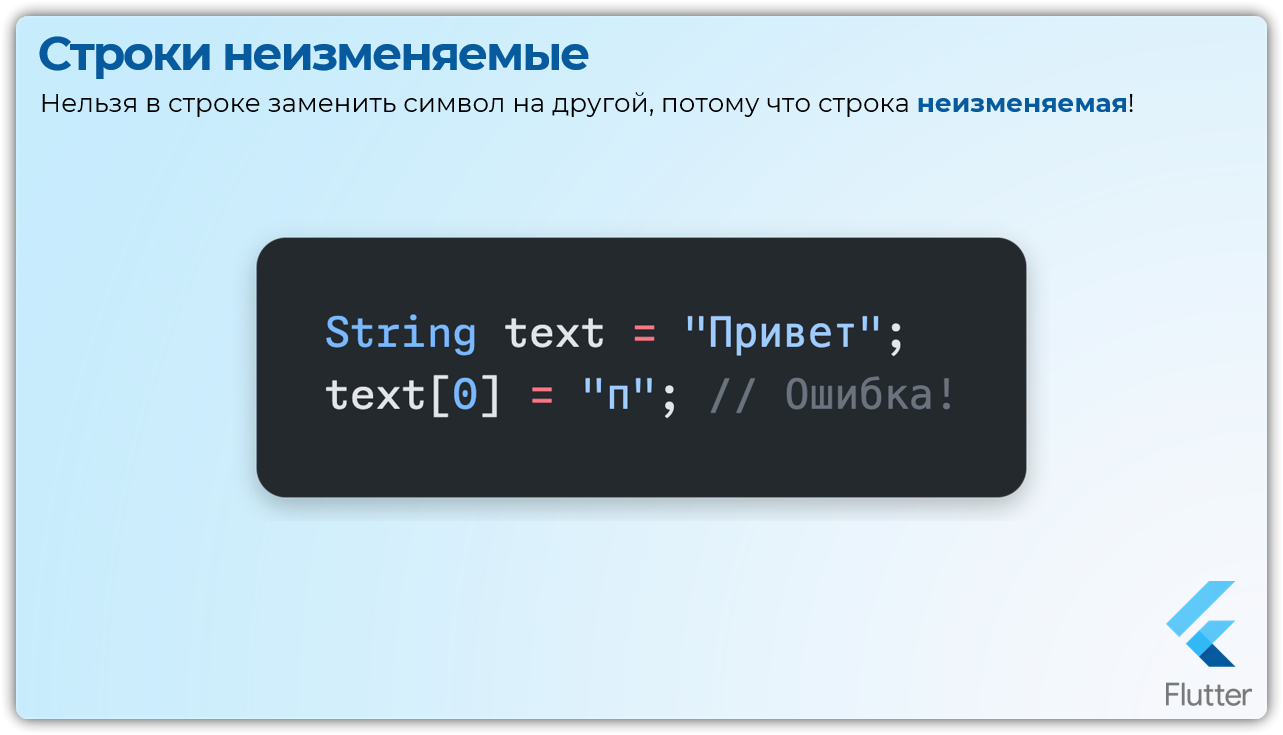 Строки в Dart — неизменяемые. Вы не можете изменить отдельный символ строки!