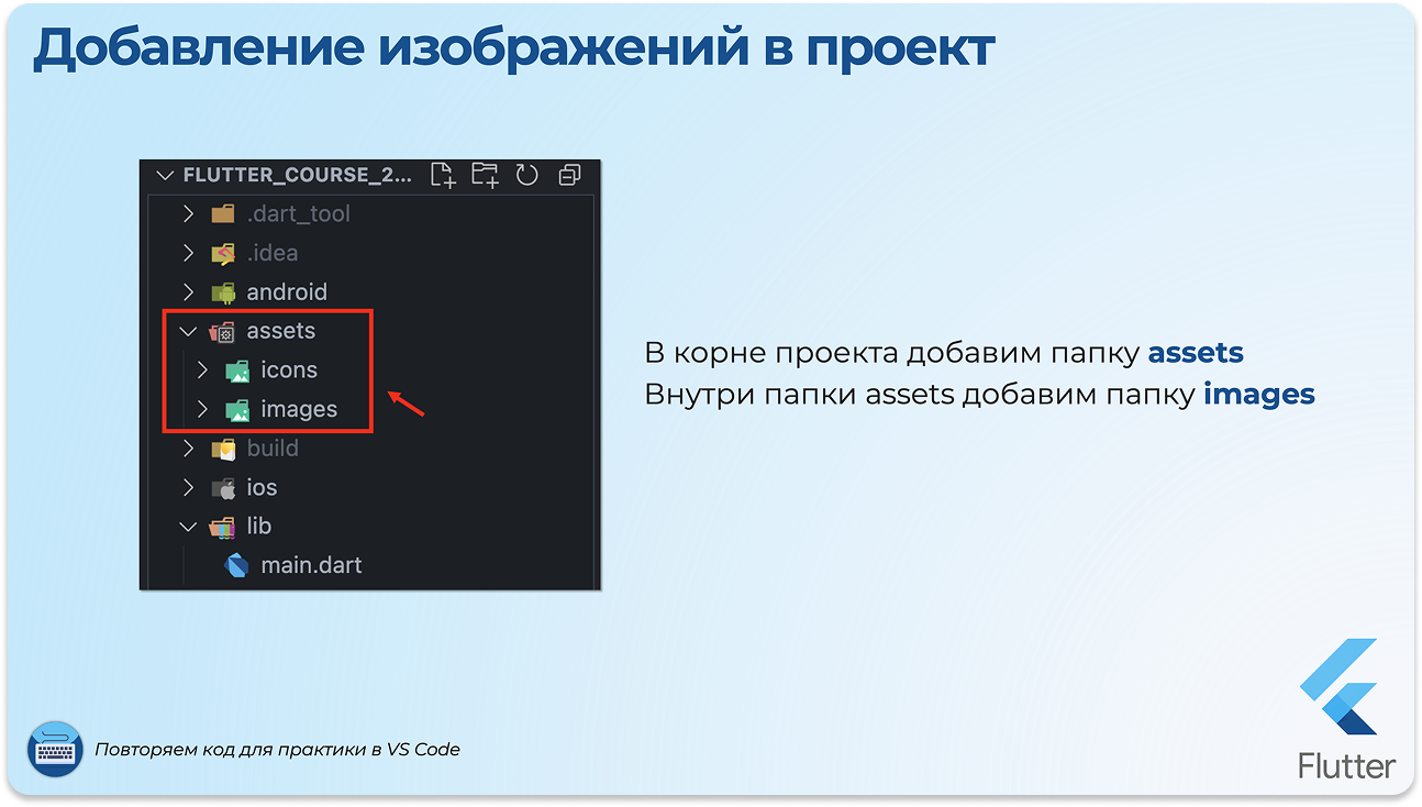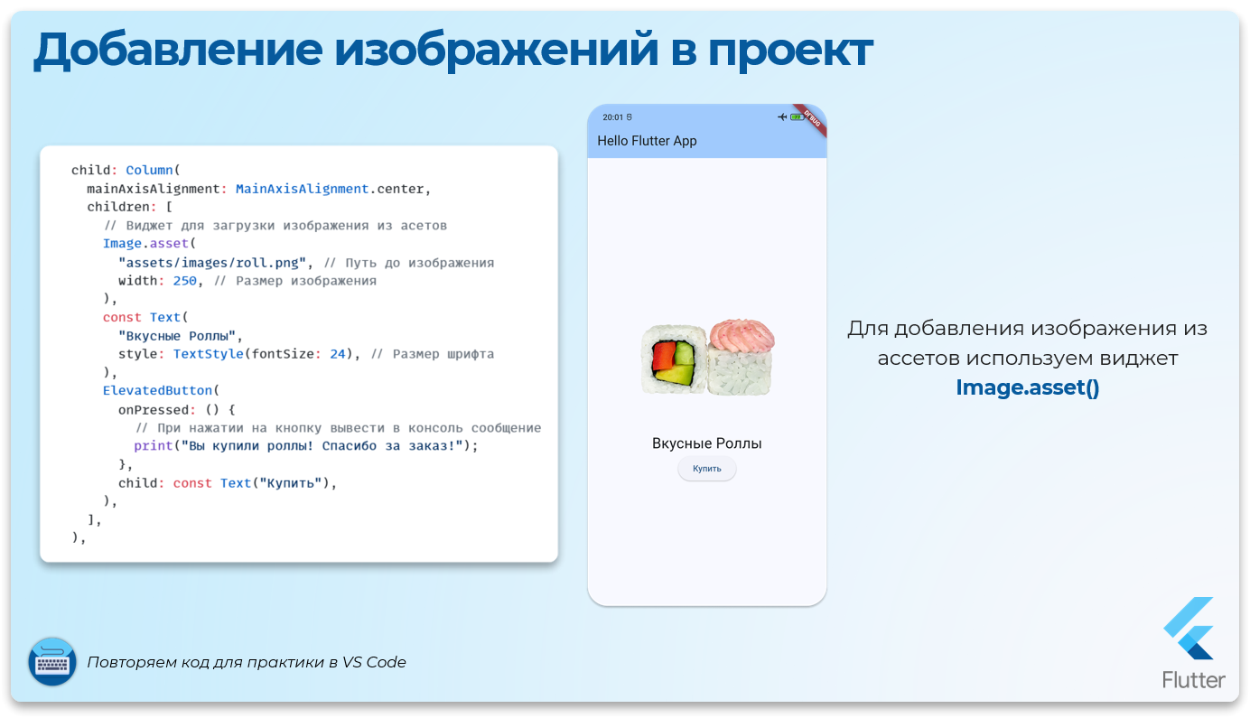 Чтобы добавить изображение из готовых ассетов, используем виджет Image.asset()