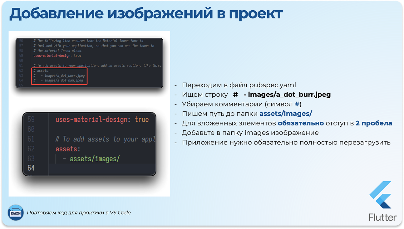 Теперь нужно правильно настроить конфигурационный файл pubspec.yaml и добавить сами изображения.