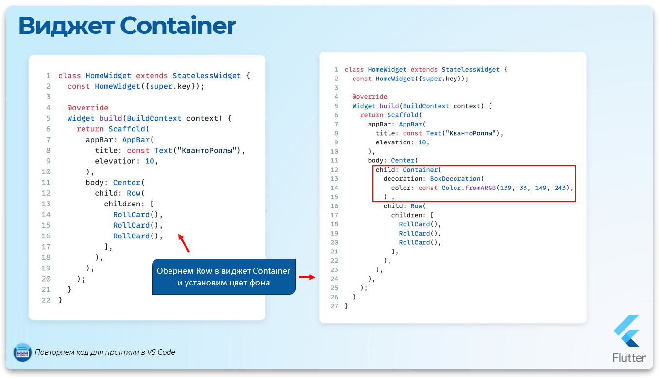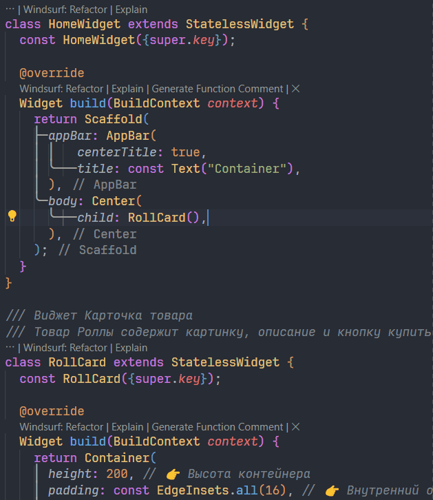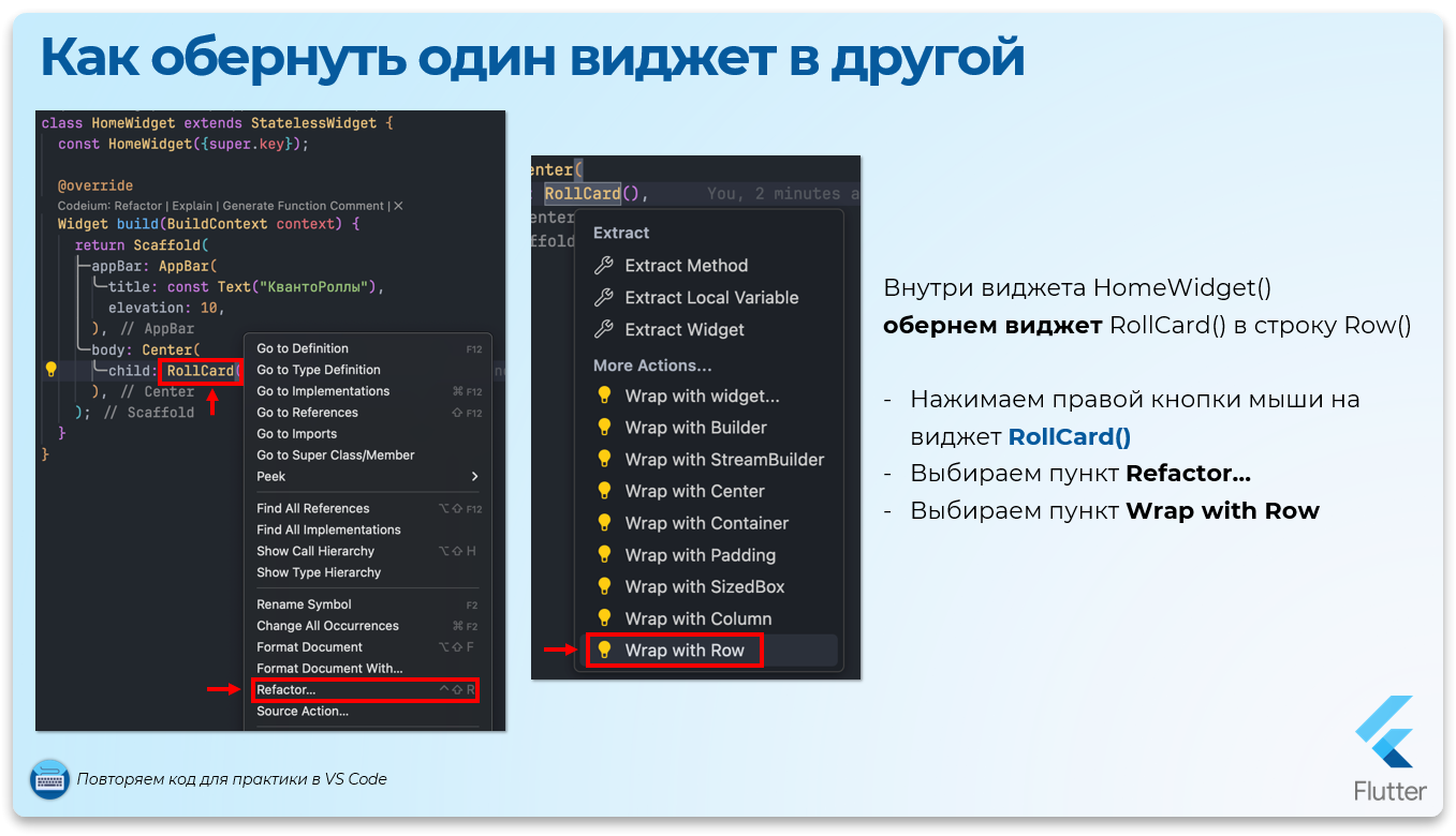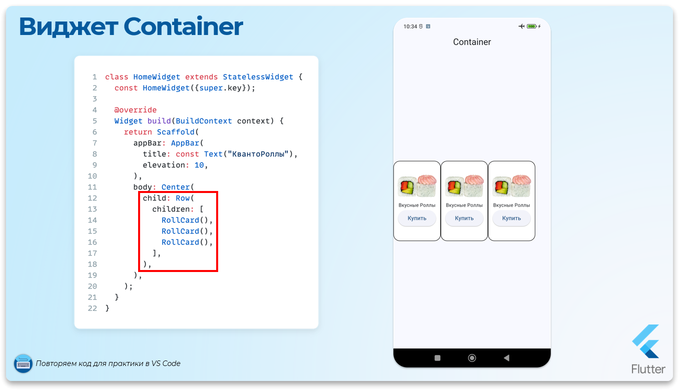 Внутри виджета HomeWidget() обернем виджет RollCard() в строку Row()