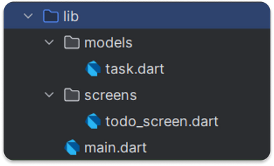 _TaskListScreenStateсоздан список_tasks, содержащий объектыTask. ListView.builderстроит список элементов- Для каждого элемента списка (