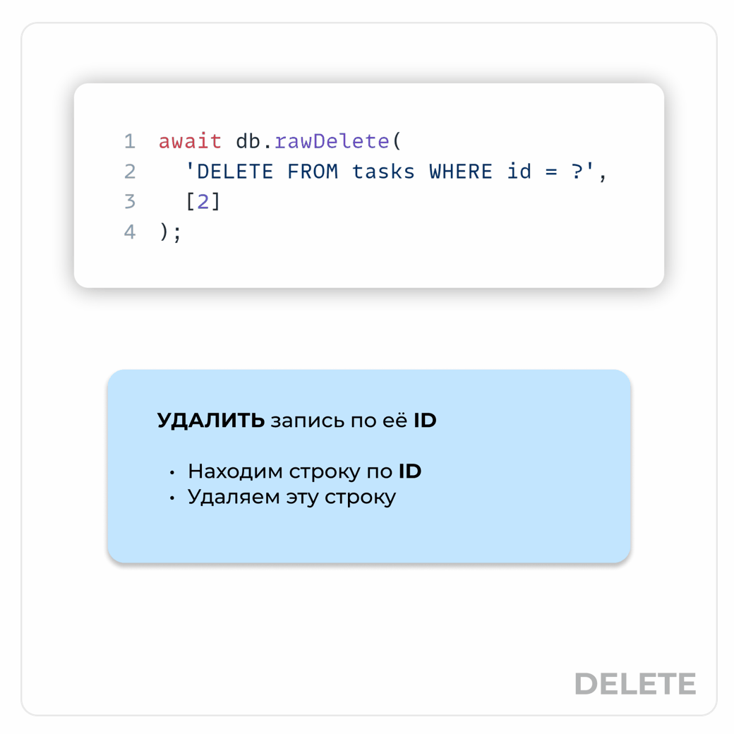 Удалить (DELETE) запись из таблицы tasks (FROM tasks) по ID этой записи (WHERE id = ?)