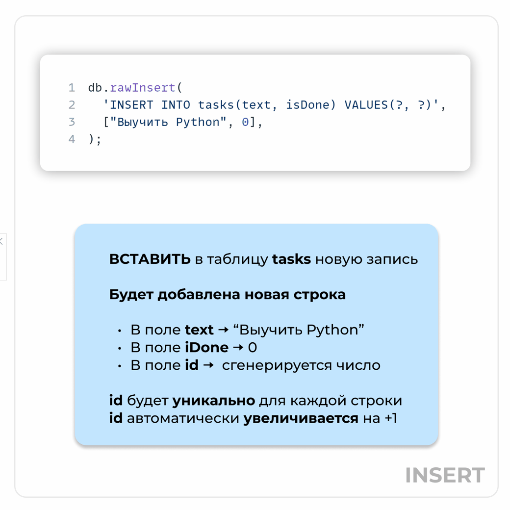 Вставить (INSERT) значения в таблицу tasks (INTO tasks) в поля id, text, isDone