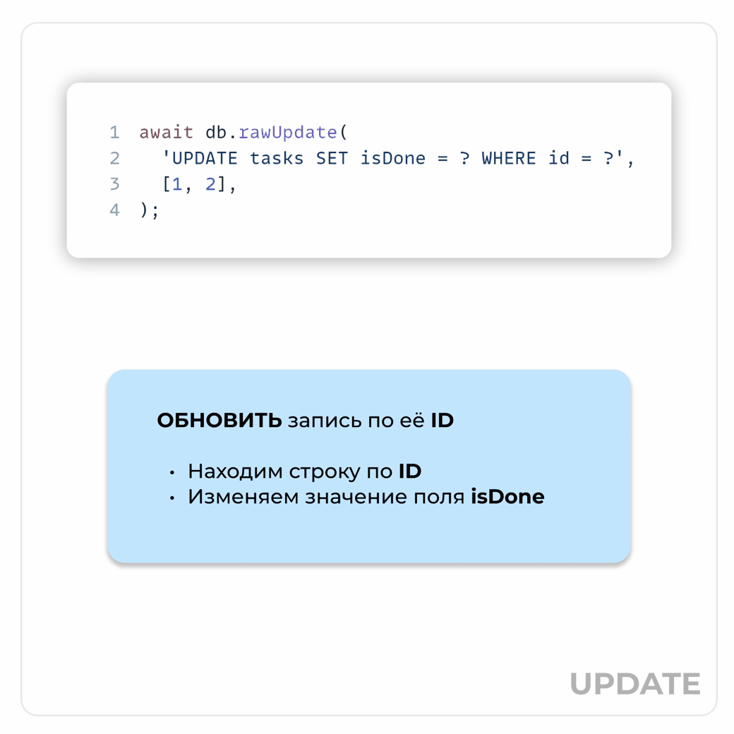 Обновить (UPDATE) запись в таблице (tasks) изменив значение isDone (SET isDone = ?) где ID этой записи равен нужному значению WHERE id = ?